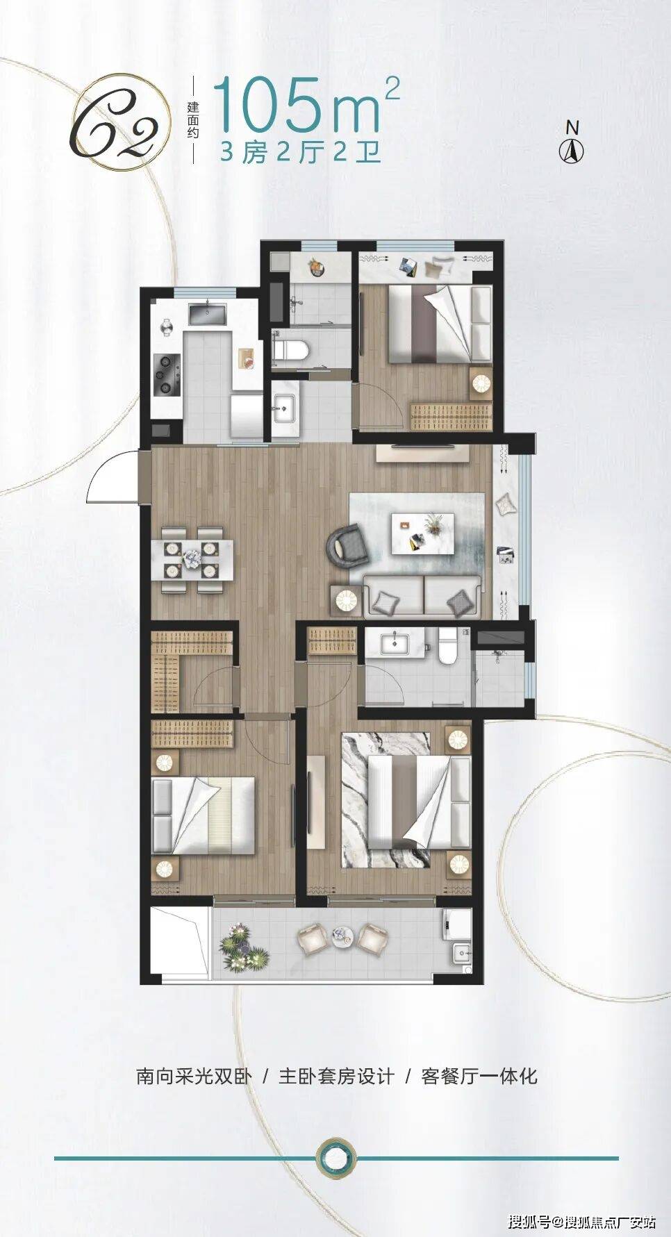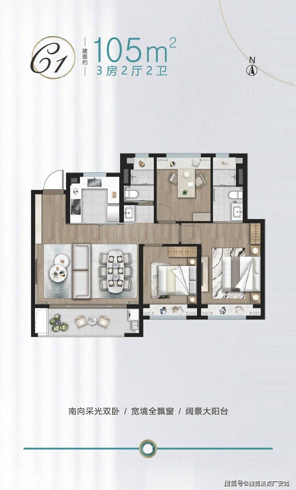好比105㎡C2的竖厅户型,全体客堂的采光面达到了约3。6米,餐客堂横向尺寸高达约7。5米,加上270°全景景不雅,全体空间标准感很是阔绰。